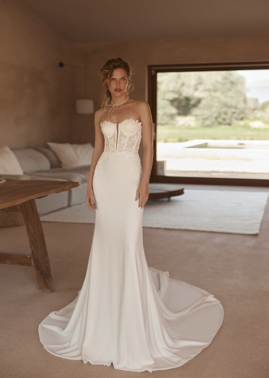 Ein elegantes Fit-&-Flare-Kleid mit korsagenartigem Oberteil, feiner Spitze und klarer Silhouette. Sinnlich, modern und zeitlos – für einen puristischen Brautlook mit besonderer Raffinesse.