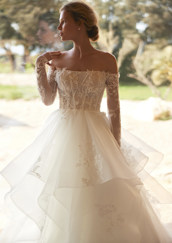 Ein traumhaftes Prinzessinnenkleid mit off-shoulder Korsage, langen Spitzenärmeln und voluminösem Tüllrock. Romantische Stickereien und feine Details verleihen dem Look eine märchenhafte Eleganz.