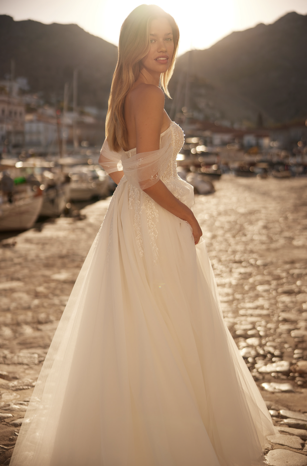 Ein zartes A-Linien-Kleid mit off-shoulder Details, feiner Spitze und fließendem Tüllrock. Romantisch, leicht und mühelos elegant – perfekt für einen modernen Brautmoment.