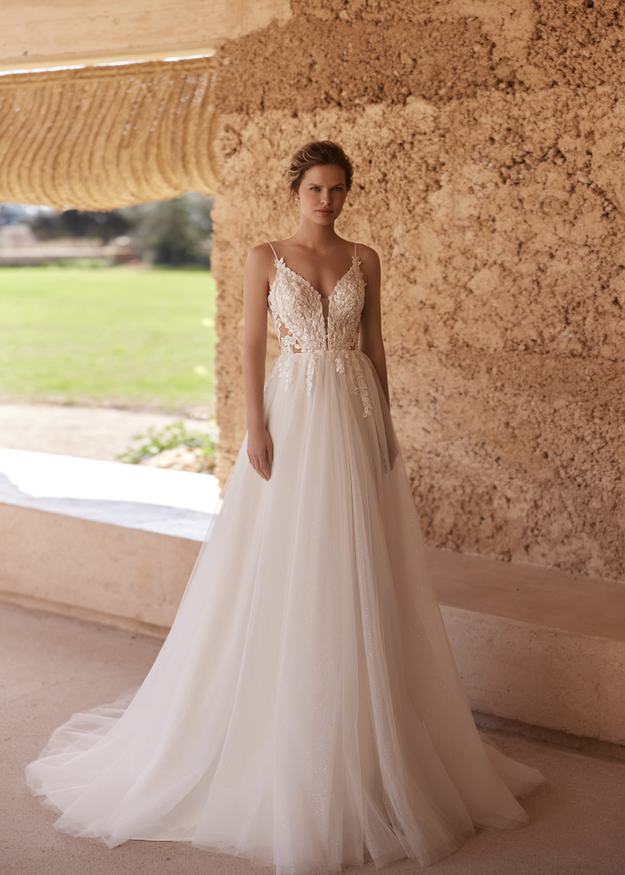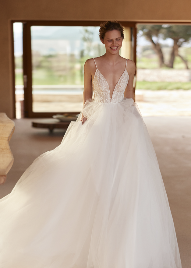 Ein luftiges A-Linien-Kleid mit tiefem V-Ausschnitt, feinen Spaghettiträgern und zarter Spitzenapplikation. Der offene Rücken und der fließende Tüllrock verleihen dem Look moderne Leichtigkeit und elegante Sinnlichkeit.