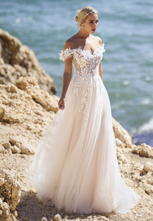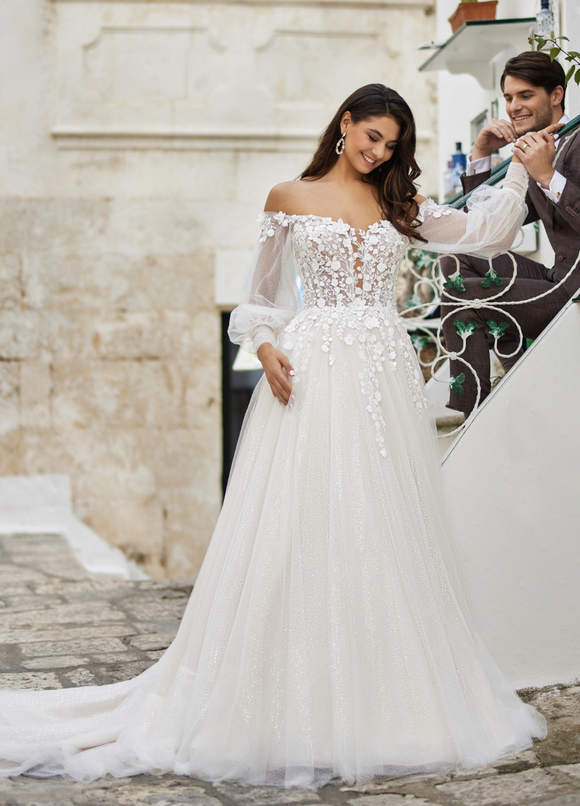 Ein traumhaft romantisches Kleid mit verspielten Off-Shoulder-Ärmeln und kunstvoll platzierten 3D-Blüten.