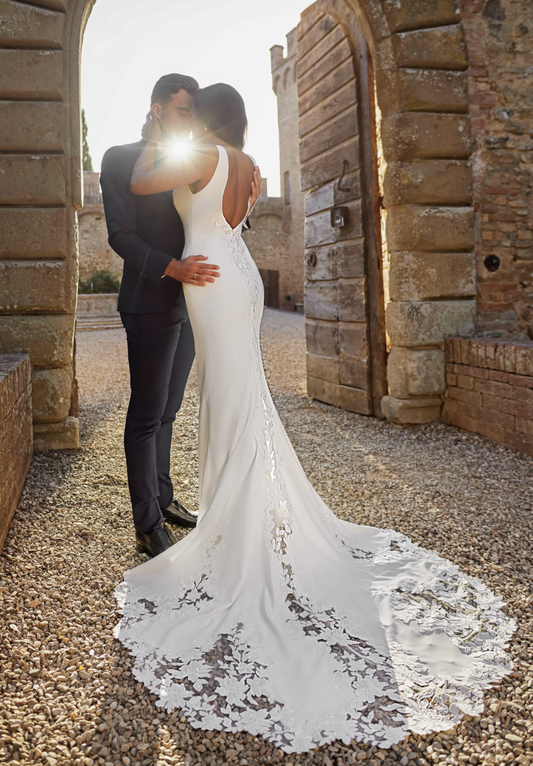 Florale Spitzenapplikationen verlaufen vom Rücken bis in die Schleppe und verleihen dem Look eine raffinierte,