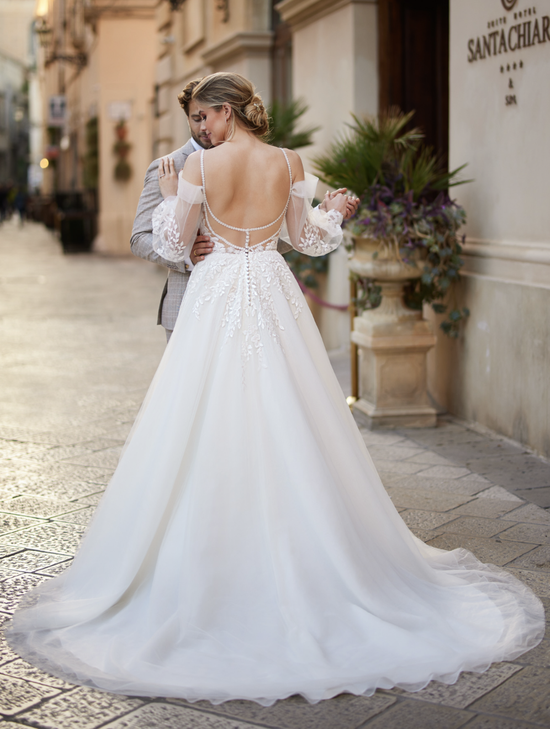 Luxuriöse, abnehmbare Ärmel verleihen diesem Double-Look-Kleid eine elegante Wandelbarkeit zwischen Trauung und Abendfeier. Das tiefe V-Oberteil mit feinen Trägern und kunstvollen Spitzenapplikationen sorgt für eine feminine Note. Der mehrlagige Rock aus Tüll, Organza und Satin fällt weich und schafft eine wunderbar romantische Silhouette.