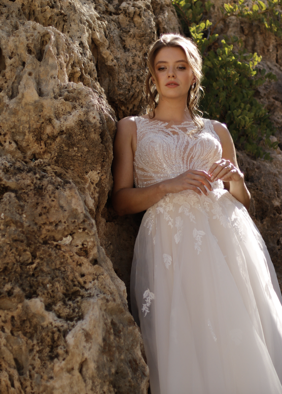 Zarte Lagen aus schimmerndem Organzagewebe verleihen diesem champagnerfarbenen A-Linien-Kleid seinen märchenhaften Charakter. Das edle Mieder begeistert mit einem hoch angesetzten Ausschnitt und einem kunstvollen Perlen- und Paillettenmuster auf nudefarbenem Tüll, das sich bis ins eindrucksvolle Rückendetail fortsetzt. Eine weich fließende Schleppe rundet den romantischen Look harmonisch ab.