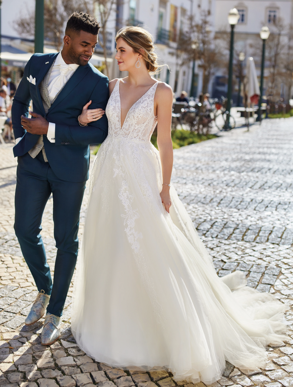 Ein auffallend zartes Kleid mit tiefem V-Ausschnitt, filigranen Spitzenbahnen und einem luftig-weichen Tüllrock. Die vertikalen Spitzenmuster strecken die Silhouette wunderschön und verleihen der Braut einen modernen, zugleich romantischen Glanz.